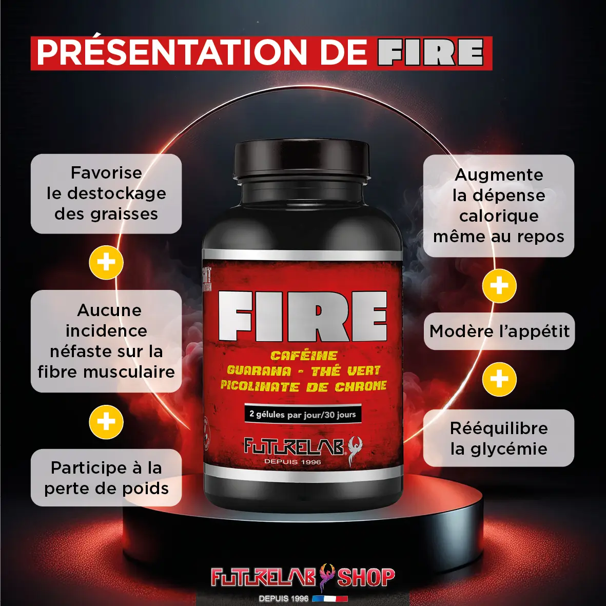 Vous cherchez un moyen simple, efficace et rapide de brûler les graisses ? Fire est votre nouvel allié. Sa formule puissante cible directement les réserves graisseuses, même sans faire de sport. Grâce à un dosage optimal et une absorption rapide, 2 gélules par jour suffisent pour enclencher la combustion des graisses. Chaque gélule contient une synergie d’actifs rigoureusement sélectionnés pour leurs effets thermogéniques et lipotropes : Extrait de thé vert : active la thermogenèse et aide à déstocker les graisses. Caféine naturelle : booste le métabolisme et l’énergie. L-Carnitine : facilite le transport des acides gras vers les cellules pour être utilisés comme énergie. Extrait de poivre noir (Bioperine®) : améliore l’absorption et l’efficacité des actifs. Choline : contribue au métabolisme normal des graisses. ✅ Apports nutritionnels (pour 2 gélules) : Caféine : 200 mg Thé vert (EGCG) : 300 mg L-Carnitine : 250 mg Choline : 82,5 mg Bioperine® : 5 mg Imaginez perdre du poids sans changer radicalement votre mode de vie. Fire agit en profondeur pour : Réduire la masse grasse. Booster l’énergie et la motivation au quotidien. Faciliter la définition musculaire. Briser les plateaux de perte de poids. Conçu pour ceux qui veulent des résultats rapides et durables, Fire s’adapte aussi bien aux sportifs qu’aux personnes actives ou sédentaires. 🔥 Rejoignez les milliers d’utilisateurs conquis par l’efficacité de Fire. 1 mois de cure = 60 gélules = 1 transformation. Commandez maintenant et commencez à brûler vos graisses dès demain. 👉 Offre exclusive en ligne : livraison gratuite dès 2 boîtes achetées ! ⚠️ Recommandations et avertissements Ne pas dépasser la dose journalière recommandée (2 gélules par jour). Contient de la caféine (200 mg par portion) – déconseillé aux enfants, femmes enceintes ou allaitantes. À conserver dans un endroit sec, à l’abri de la lumière. Tenir hors de portée des enfants. Ce complément ne remplace pas une alimentation variée et équilibrée ni un mode de vie sain.